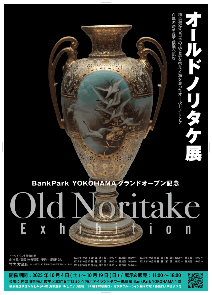 CRAFT.では「Bank Park YOKOHAMA」のグランドオープンを記念して、10月4日(土)から19日(日)まで、この歴史的建造物が作られた明治時代に初めて横浜港から日本の技と美を携えて海を渡り、欧米で人気を博したオールドノリタケの展示と販売および竹内友章氏(オールドノリタケ研究家で日本を代表するコレクター)によるトークイベント(全10回※)を実施いたします。